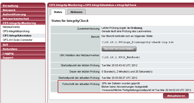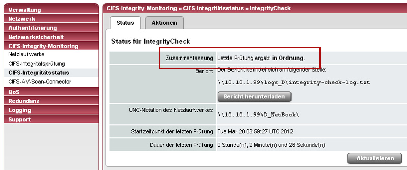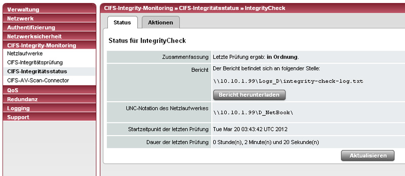 Die Integritätsprüfung kann nun entsprechend dem konfigurierten Zyklus ausgeführt werden bzw. kann auch manuell aktiviert werden. Dies geschieht im Menü “CIFS-Integritätsstatus” unter dem Reiter Aktionen.