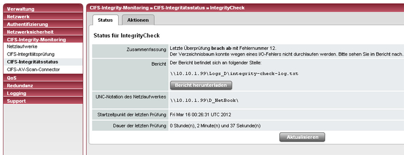 Auf Übernehmen klicken und dann unter “CIFS-Integrity-Monitoring - CIFS Integritätsstatus” auf Anzeigen klicken, dann den Reiter Aktionen auswählen und die Datenbank Initialisieren klicken.
