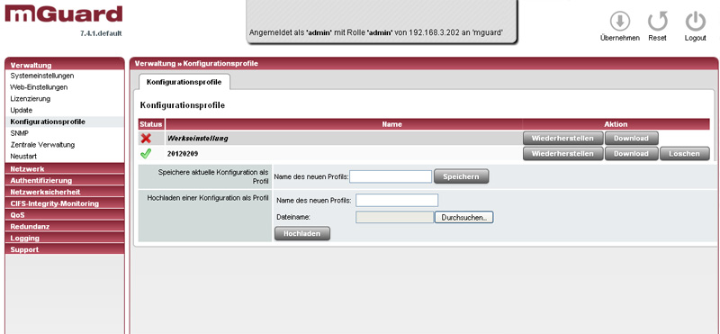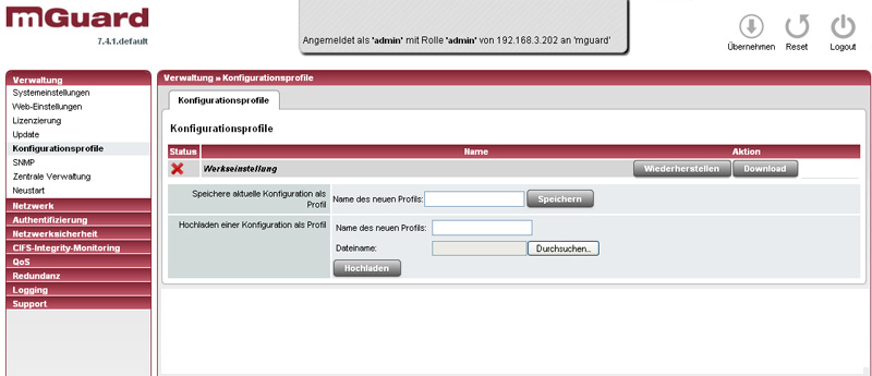 Das Konfigurationsprofil, mit dem der mGuard aktuell arbeitet, ist nicht in dieser Liste aufgeführt. Wenn man die aktuelle Konfiguration herunterladen will, muss man diese vorher unter einem neuen Namen abspeichern.