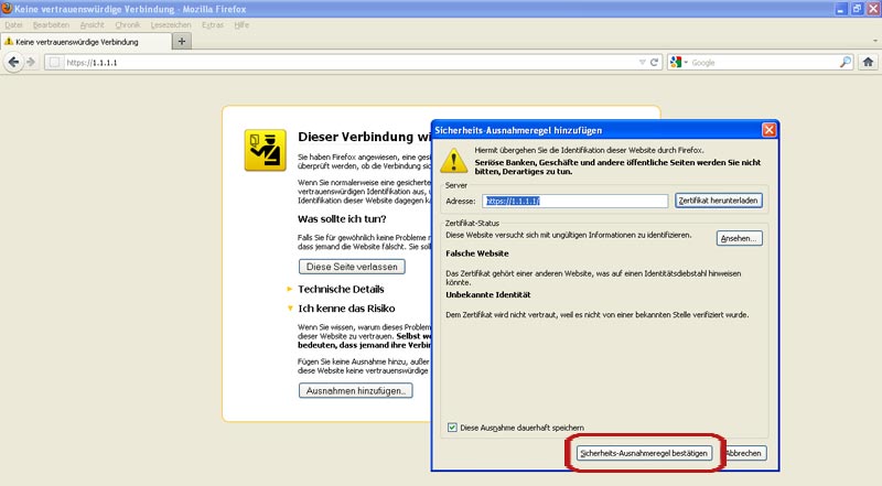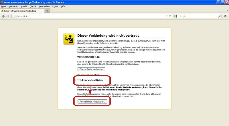 Wenn Sie den Proxy ausgeschaltet haben - versuchen Sie wieder auf https://1.1.1.1 zuzugreifen - Sie sollten dann die Zertifikats-Fehlermeldung sehen.