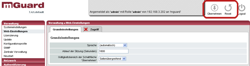 “Übernehmen” - alle (seitenüergreifend gemachten) Änderungen werden aktiviert “Reset” - alle Werte werden auf die Ausgangswerte zurückgesetzt, solange nicht vorher “Übernehmen” geklickt wurde.