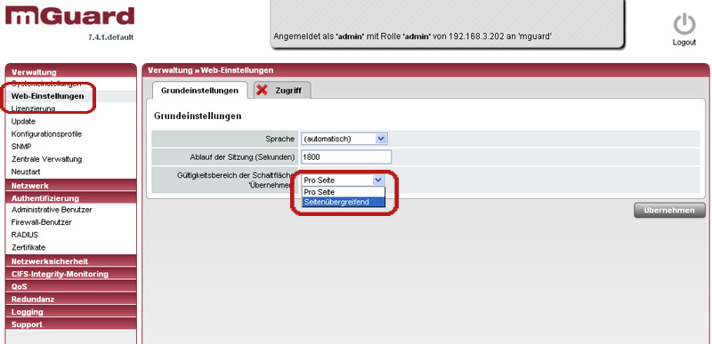 Unter “Web-Einstellungen” finden Sie die Auswahlmöglichkeit für den Gültigkeitsbereich der Schaltfläche Übernehmen - entweder “Pro Seite” oder “Seitenübergreifend”. Im Auslieferungszustand ist “Pro Seite” aktiv.