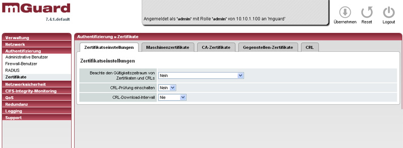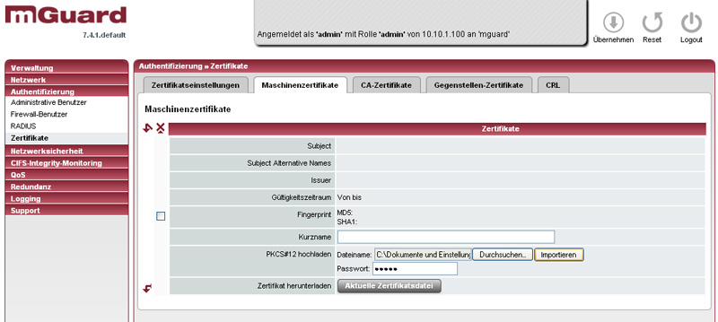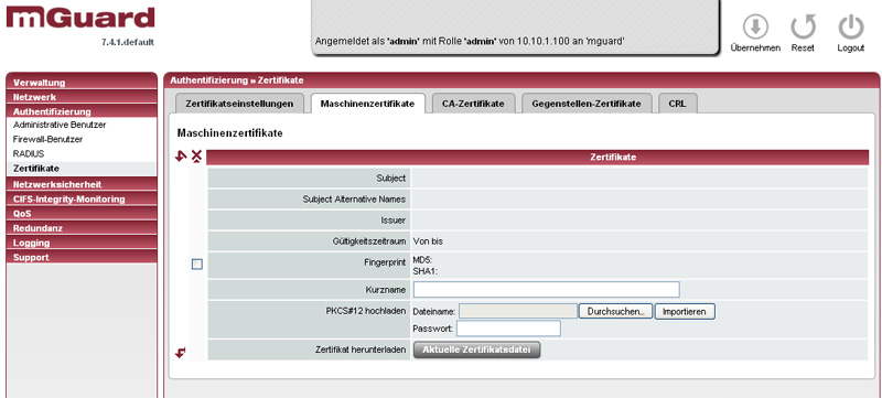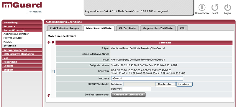 Der Name des Maschinenzertifikats ist “mGuard-1”. Wir könnten ihn ändern oder auch so lassen.