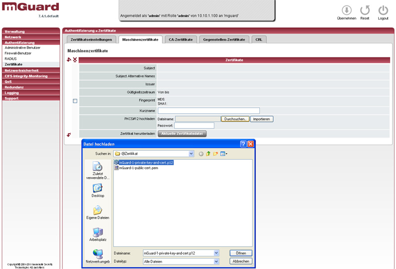 Nun müssen wir das vorgefertigte Maschinenzertifikat importieren. Wir durchsuchen also unseren Computer und wählen das vorgefertigte Zertifikat (mGuard-1-private-key-and-cert.p12) aus.